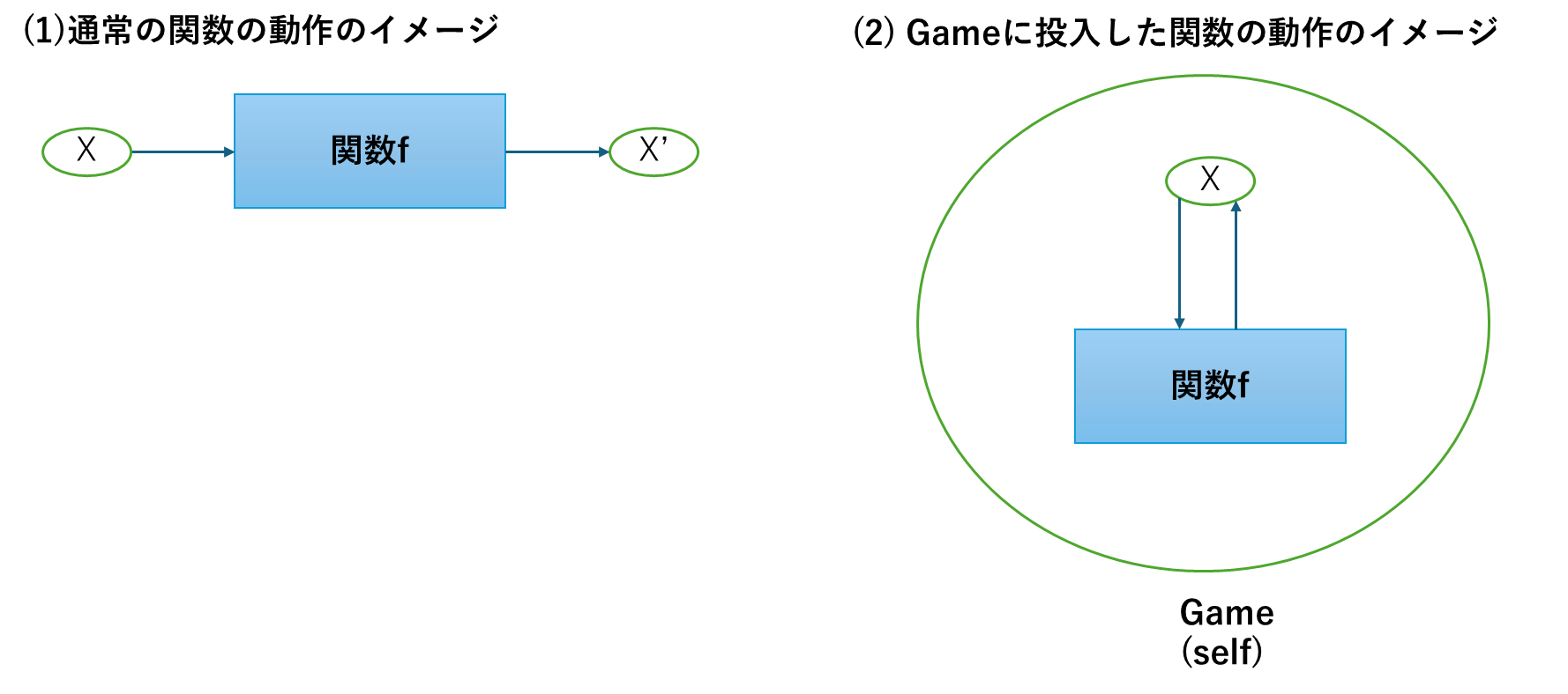 以上の違いをあらためて図示すると図1のようになります。Gameに投入した関数はGameの内部のフィールドxに対して直接働きかけます。この時のGame自身のことがselfと表現されていることになります。